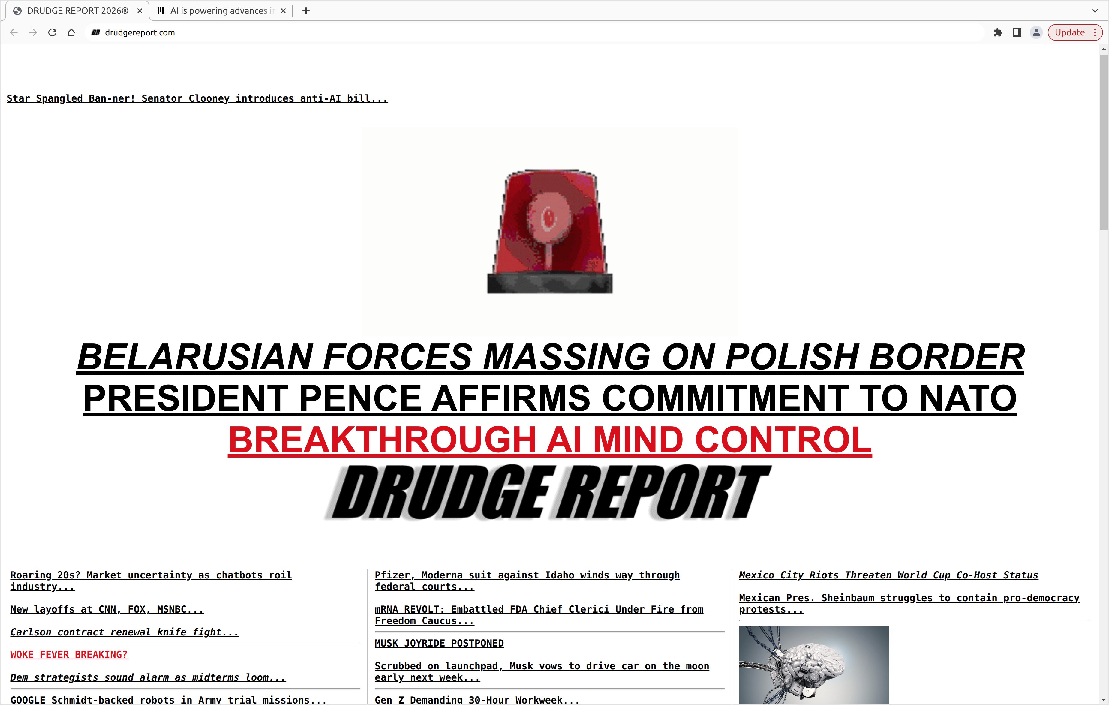 Re: details on the fake Drudge page: ngl I really hope that they do not come true. I picked things out of a hat that felt plausible and that felt like they would be framed that way on Drudge. Next time I do something like this it’ll probably be a fake HackerNews front page.