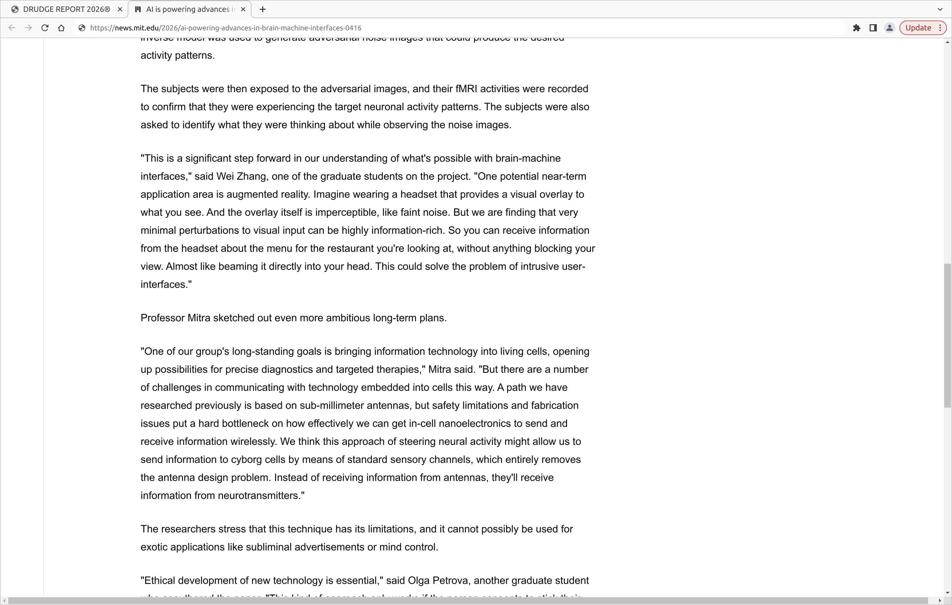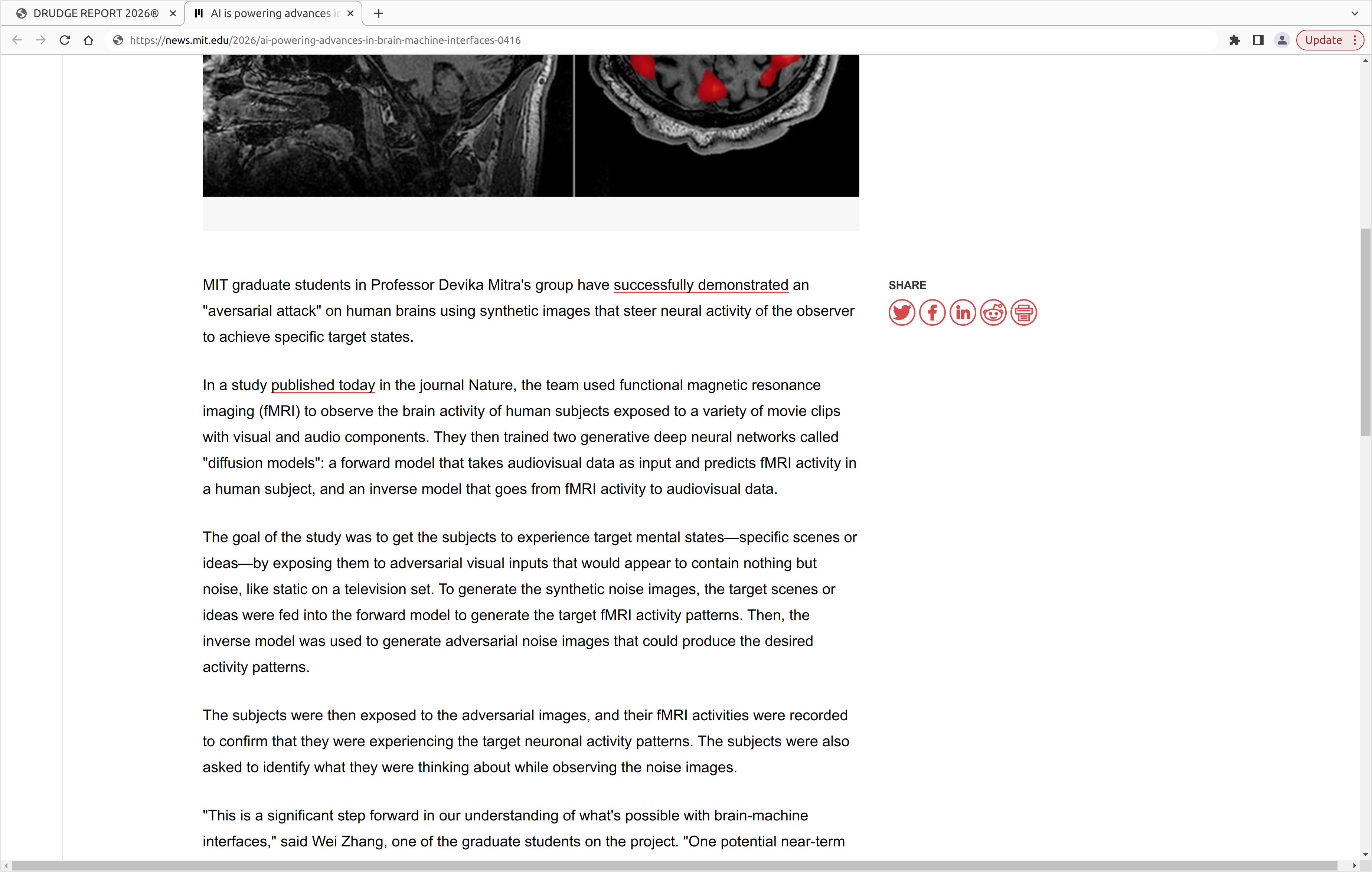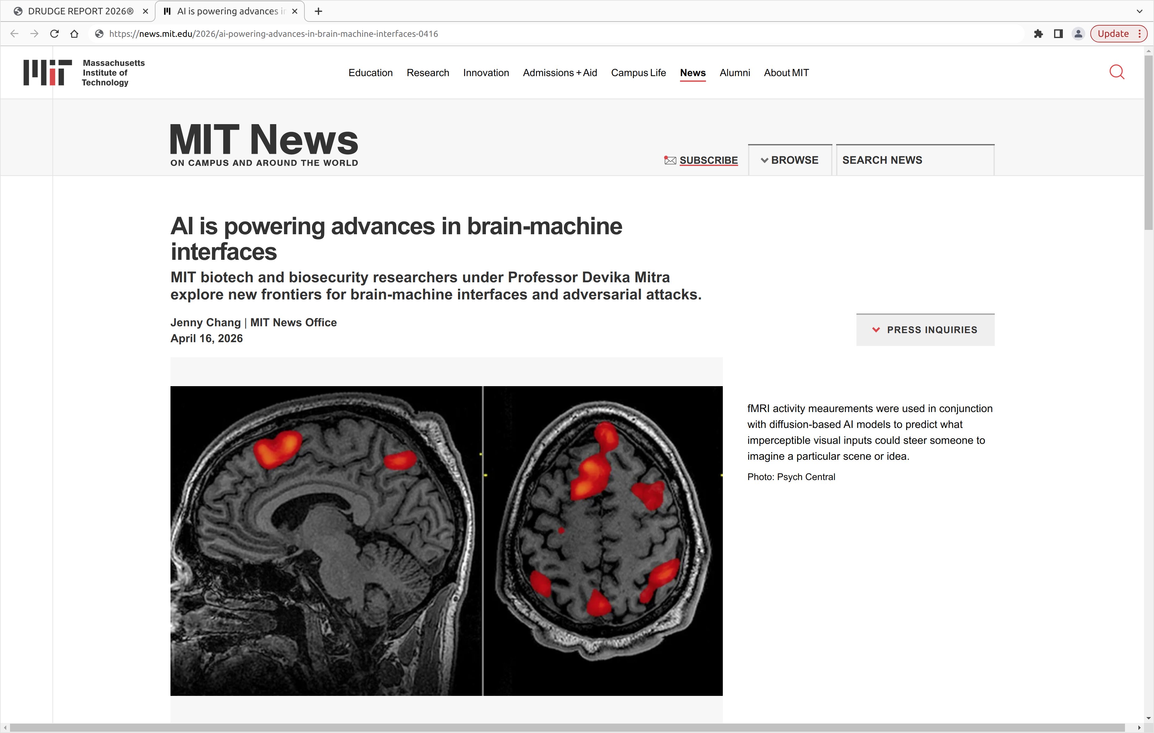The mix of what’s real and what’s not: the fake Drudge page refers to real people, but the fake MIT News article only refers to fictitious people. The research sketched out in the fake MIT News article is strongly inspired by some real research that is happening at MIT, though!