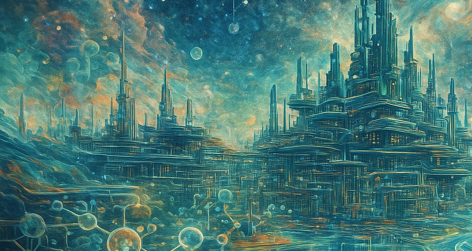 “A stylized cross-section of an alien planet, showing layered chemistry glowing with emergent complexity and hints of intelligence arising from matter. Rich but clean illustration style, blending scientific diagram aesthetics with cosmic wonder. No text. 960×512 banner format.”